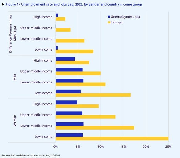 L'estudi 'Noves dades sobre les diferències de gènere al mercat laboral' de l'Organització Internacional del Treball mostra que les bretxes laborals més petites es troben als països d'alts ingressos, on els homes tenen una taxa del 7,4% i les dones del 9,6%. Tot i això, a mesura que disminueix l'ingrés nacional, la bretxa laboral augmenta, igual que la bretxa entre dones i homes.
